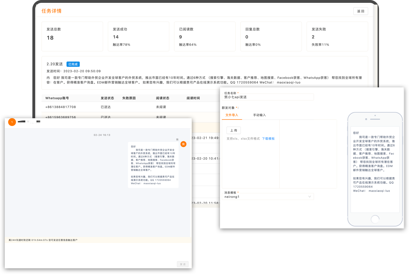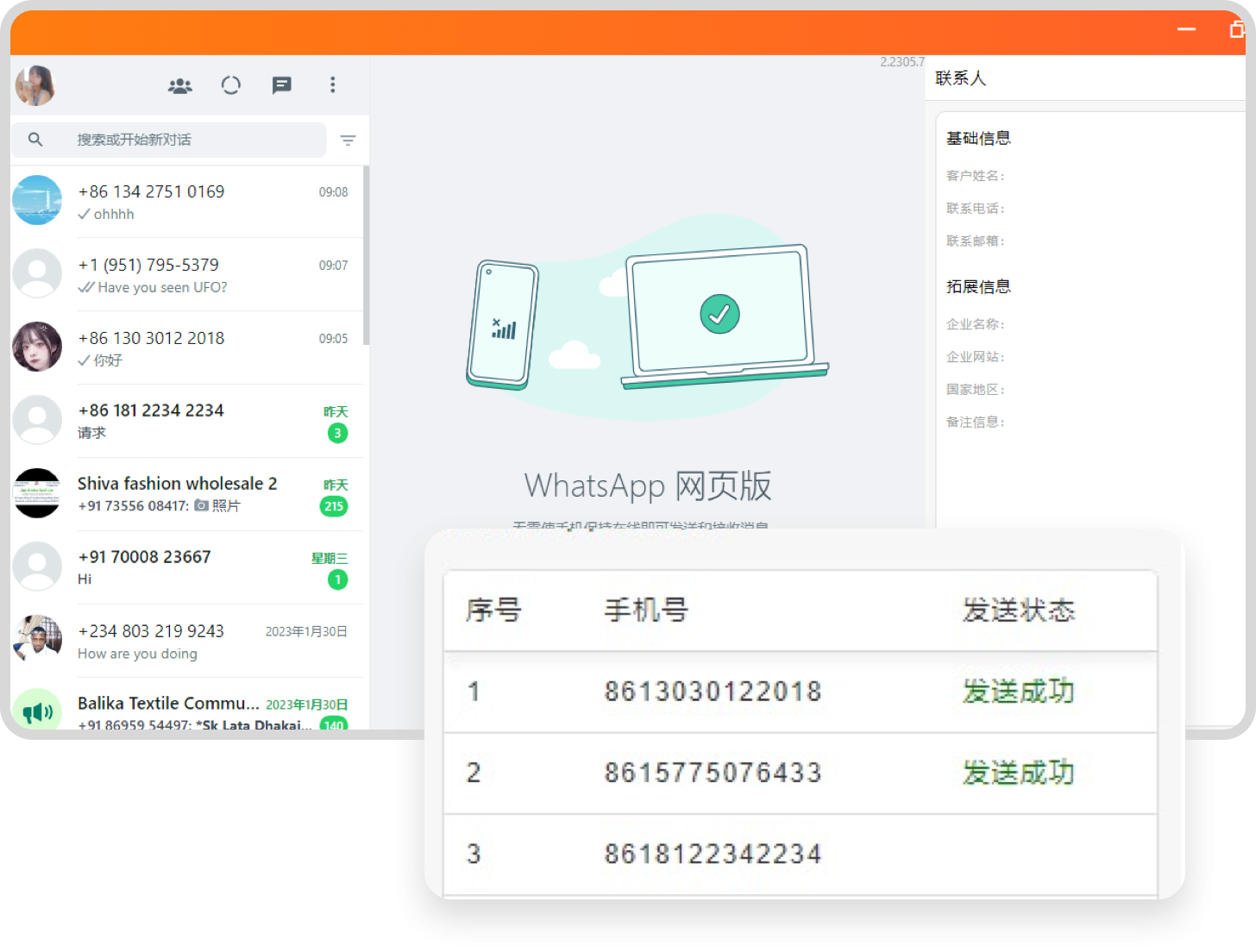 WhatsApp营销群发无需存入通讯录添加好友,可直接批量发送触达客户,保障高效触达。