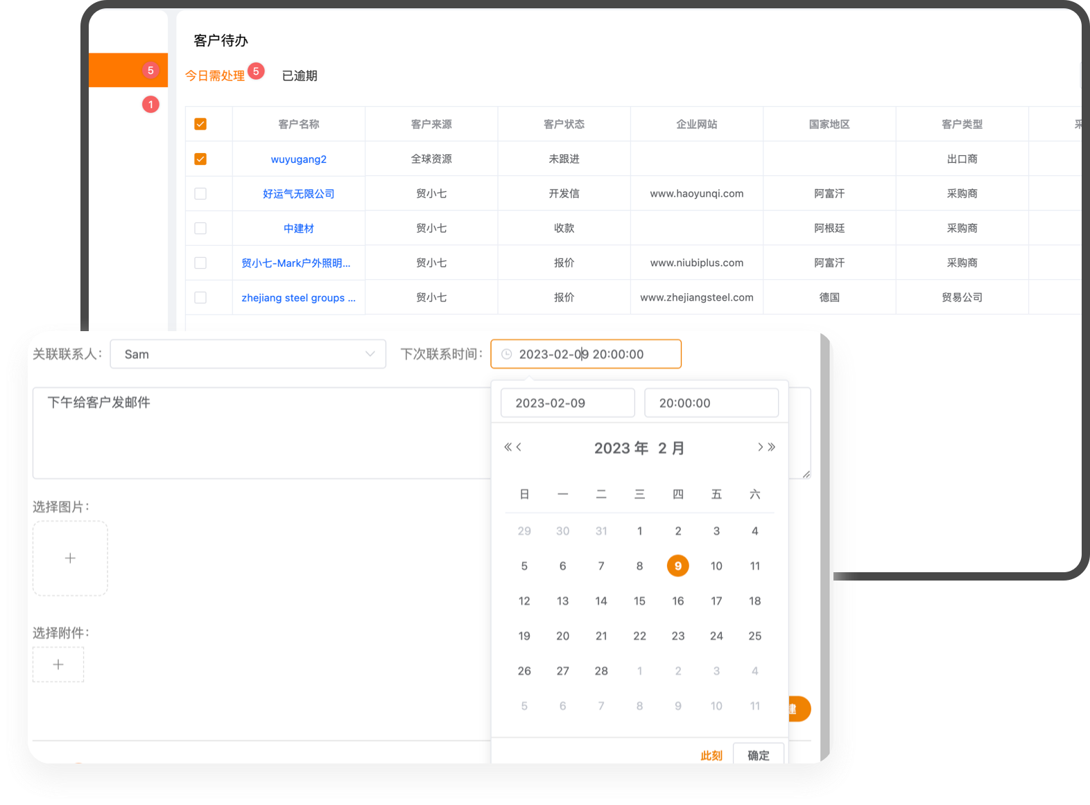 外贸客户的跟进、成交周期较长,通过创建待办事项,系统会及时提醒您处理客户跟进事项。