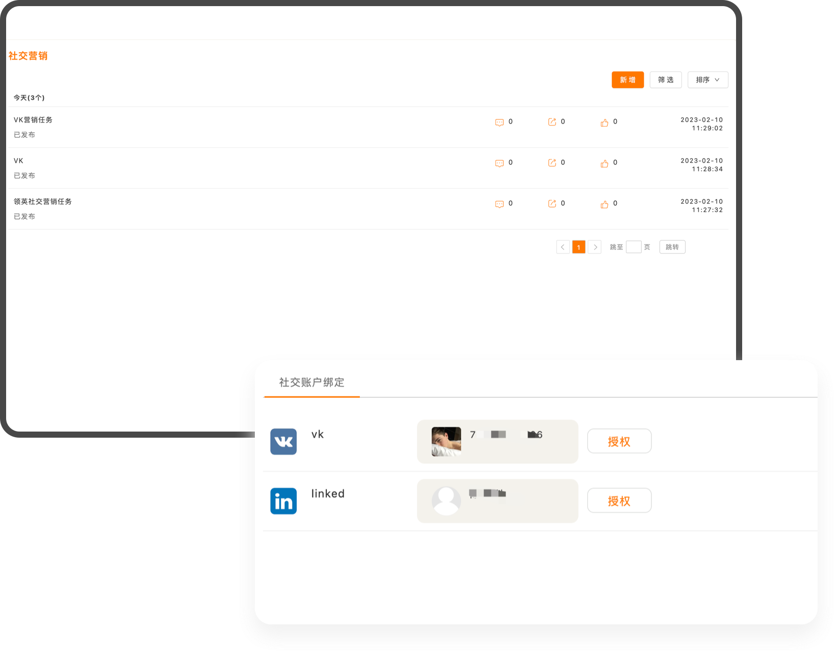 贸小七已对接VK、领英官方API,可直接在系统内发送帖子,查看到帖子的互动消息动态内容,一站式管理社媒账号运营管理。