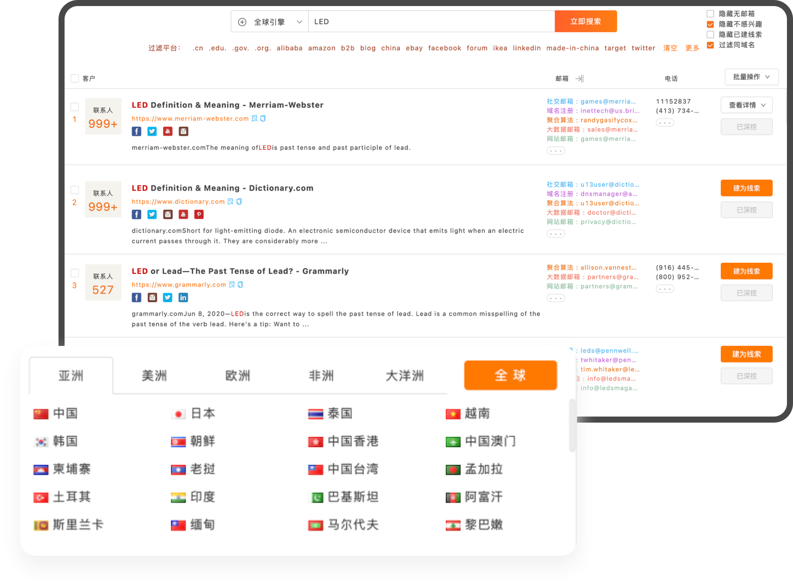 通过关键词、国家、职位精准找到相关的领英主页地址,并通过贸小七强大的邮箱挖掘功能,获取领英账号的邮箱??赏ü煊蚝陀始ǖ来ゴ镉?。